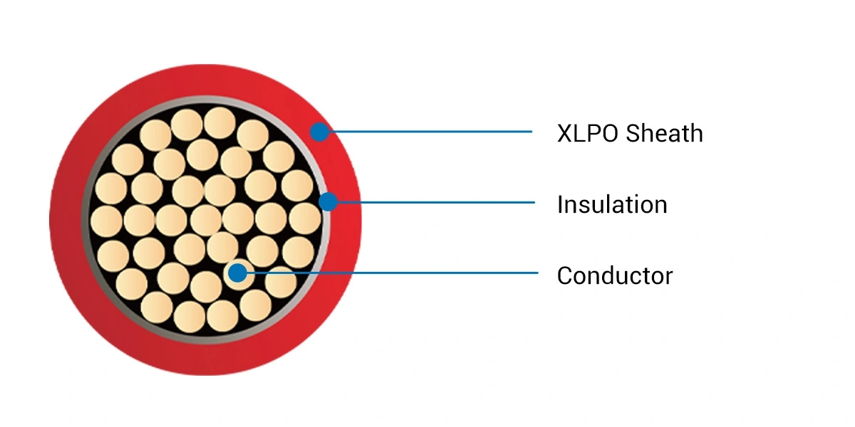 PV wire is a specialized cable used to interconnect solar panels within photovoltaic systems. It typically features a conductor made of bare or tinned copper, insulated with cross-linked polyethylene (XLPE). This material offers excellent resistance to ozone, UV radiation, and moisture, making PV wire highly durable even in harsh outdoor environments. PV Wire complies with UL Standard 4703.
